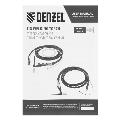 Горелка сварочная TIG DENZEL WP26, разъем 2 пина, 3 метра