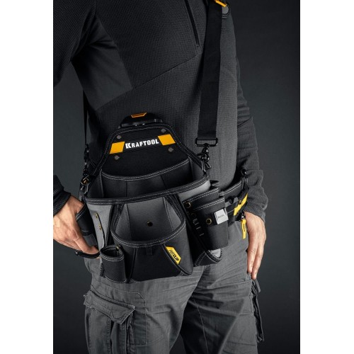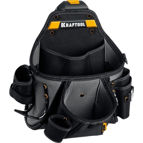 Поясная сумка KRAFTOOL 38767, предназначена для переноски разнообразного инструмента, необходимого при проведении ремонтно-монтажных работ. 14 карманов и петель. Размер 320х310 мм.