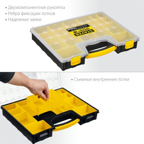 Органайзер STAYER 2-38032_z01, применяется для хранения инструментов и принадлежностей. Съемные лотки органайзера позволяют организовать удобное хранение и переноску принадлежностей к инструментам.