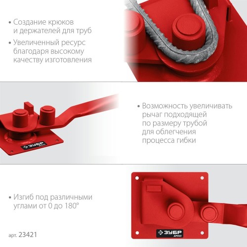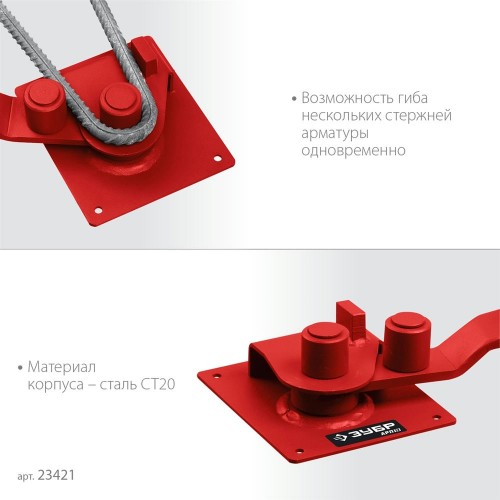 Профессиональный Арматурогиб ЗУБР для плавного гиба гладкой и рельефной арматуры Закалёная сталь Усиленная конструкция Создание крюков и держателей для труб Возможность увеличивать рычаг для облегчения процесса гибки Отверстия для надёжной фиксации Увеличенный ресурс