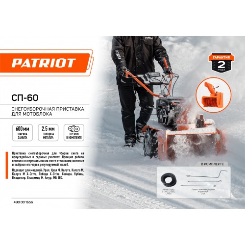 Приставка снегоуборочная PATRIOT для уборки снега на приусадебных и садовых участках. Принцип работы основан на перемалывании снега стальными шнеками и выбросе его через регулируемый желоб. Подходит для моделей: Калуга, Калуга М, Калуга М X-Drive, Победа X-Drive, Самара, Кубань, Владимир, Владимир М, Амур, МБ 800.