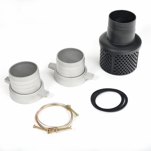 Комплект: переходники на всасывающий и подающий шланги, хомуты, сетка-фильтр на всасывающий шланг.