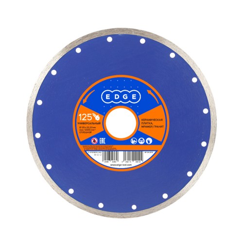 Наружный диаметр: 125 мм;Внутренний диаметр: 22,23мм; Толщина алмазного слоя:2.3мм Высота алмазного слоя: 7мм Обрабатываемый материал: керамическая плитка, мрамор, гранит Работа с водой: нет