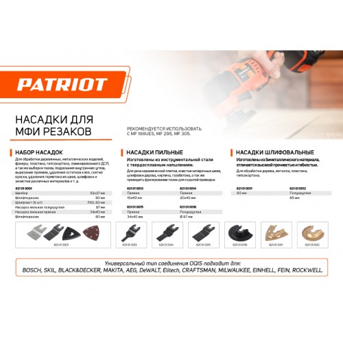 "Насадка пильная изготовлена из биметаллического материала отличается высокой прочностью и гибкостью. Применяется для обработки дерева, металла, пластика, гипсокартона. Рекомендуем использовать с МФИ PATRIOT MF 188UES, MF 295, MF 305.