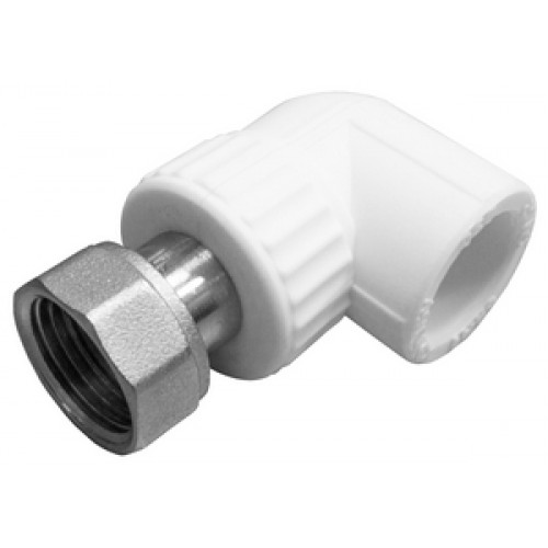 Угольник с накидной гайкой — двухсторонний полипропиленовый фитинг для соединения под углом 90° друг к другу полипропиленового трубопровода и компонента инженерной системы с резьбовым подключением. Монтаж осуществляется с помощью накидной гайки.