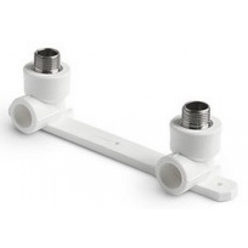 Комплект настенный для смесителя представляет из себя комбинированный полипропиленовый фитинг. Используется для монтажа к трубопроводу и установки смесителя непосредственно на стене. Латунные части производятся методом горячего штампования, пластиковые - методом литья под давлением.