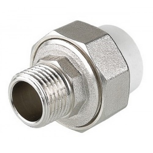 Полипропиленовый фитинг для создания разъемного, с использованием накидной гайки, соединения полипропиленового трубопровода с трубопроводом или арматурой из других материалов. Уплотнительное кольцо выполнено из синтетического каучука EPDM. Резьба фитинга – наружная трубная по ГОСТу 6357.