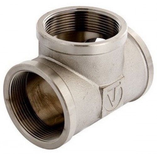 Латунный никелированный трехсторонний фитинг, равнопроходной. Резьба – внутренняя, цилиндрическая трубная по ГОСТу 6357 (ISO 228, EN 10226), совместимая также с наружной конической трубной резьбой по ГОСТу 6211 (ISO R7).