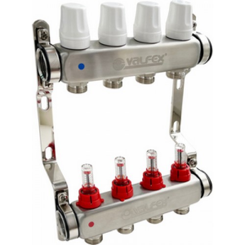 Блок коллекторов из нержавеющей стали с регулирующими клапанами и расходомерами ТМ VALFEX – позволяет производить балансировку петель с помощью настроечных клапанов с расходомерами при включенном циркуляционном насосе.