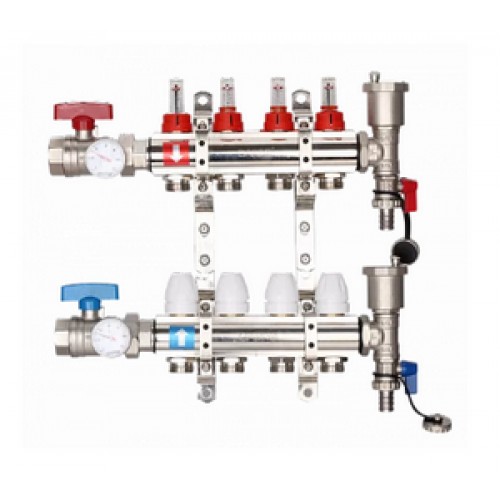 Комплектация: коллектор с термостатическими клапанами и расходомерами - 1 комплект, тройник со сливным клапаном и воздухоотводчиком 1" - 1 пара, кран шаровой с термометром 1"- 1 пара, кронштейн - 1 пара.