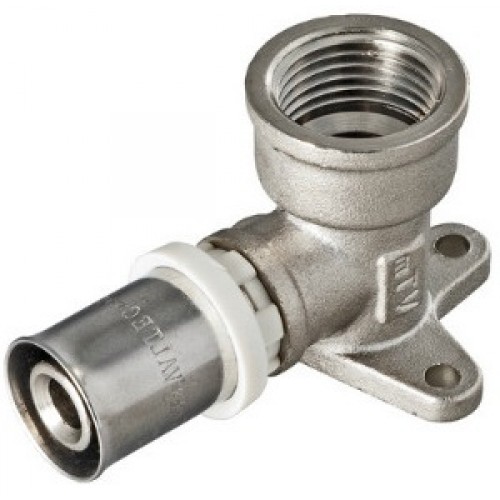 Угловой пресс-фитинг с креплением (водорозетка) для соединения металлополимерной трубы (металлопластиковые трубы) или трубы из сшитого полиэтилена с компонентом системы, имеющим резьбовое подключение. Резьба фитинга – внутренняя трубная по ГОСТу 6357. Основное назначение – монтаж сантехнического смесителя.