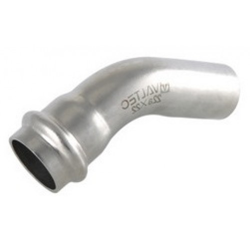 (VTi.958.I) Однораструбный пресс-угольник 45° из нержавеющей стали обеспечивает соединение тонкостенных стальных труб систем водоснабжения, отопления, иных инженерных и технологических установок с рабочей температурой до 120 °С и давлением до 16 бар. Изделие изготовлено из стали AISI 304. Материал уплотнения – эластомер EPDM. Отдельно можно приобрести уплотнительные кольца из FPM (витон); в этом случае максимальная рабочая температура увеличивается до 140 °С.