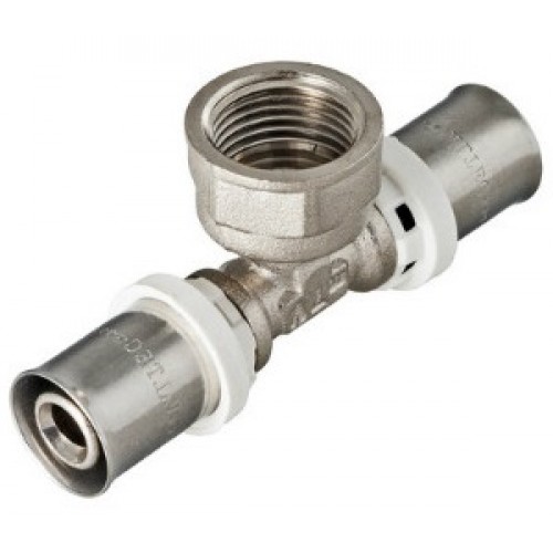Пресс-фитинг – тройник с переходом на внутреннюю резьбу служит для присоединения к металлопластиковым (металлополимерным) трубам и трубам из сшитого полиэтилена элемента системы, имеющего наружную резьбу. Резьба фитинга – трубная по ГОСТу 6357.