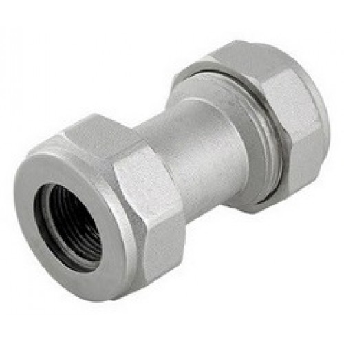 Модель VTr.803.N – фитинг обжимной для стальных труб прямой. При монтаже временных и ремонте постоянных стальных трубопроводов часто отсутствует возможность использовать сварку или производить резьбонарезные работы. В этих случаях удобно использовать обжимные фитинги серии VTr.800, обеспечивающие соединение стальных водогазопроводных труб с помощью двух гаечных ключей. Корпус и накидная гайка фитингов изготовлены из сантехнической латуни, никелированы, разрезное обжимное кольцо («сухарь») – из закаленной нержавеющей стали, которая намного превосходит по твердости материал соединяемой трубы. Смыкаясь при завинчивании накидной гайки, кольцо врезается в стенку трубы, надежно фиксируя соединитель. Через латунную шайбу «сухарь» воздействует на толстое уплотнительное кольцо из EPDM Sh70, плотно обжимающее трубу и герметизирующее соединение. Обжимные фитинги являются разборными, могут использоваться многократно, однако должны быть доступны для обслуживания (нельзя замоноличивать). Допускаются угловые подвижки трубы в пределах 3°.