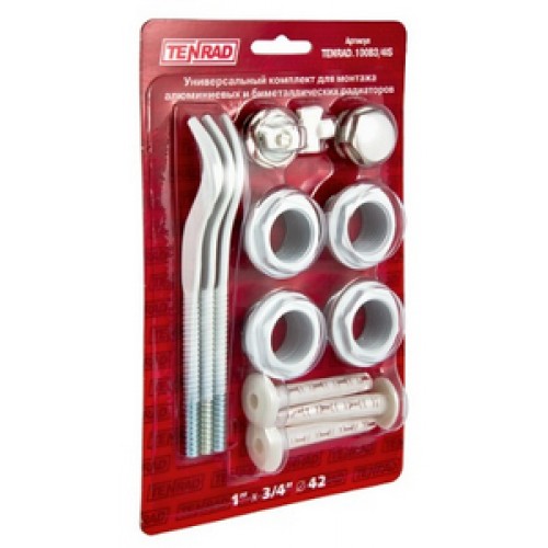 (TENRAD.100B1) Комплект предназначен для монтажа алюминиевых и биметаллических радиаторов с присоединительным размером верхнего и нижнего коллекторов 1" (внутренняя резьба). В состав комплекта включены четыре футорки 1 x ½" – две правые и две левые. Футорки снабжены силиконовыми прокладками. Также в комплект включены пробка для футорки, ручной самоуплотняющийся воздухоотводчик, ключ для воздухоотводчика, кронштейны и дюбели для крепления радиатора к стене. Кронштейны, как и футорки выполнены из оцинкованной стали, окрашены белой (RAL 9010) эпоксидной эмалью. Элементы комплекта рассчитаны на рабочее давление до 16 бар. В качестве теплоносителя в системе может применяться как вода, так и незамерзающая жидкость.