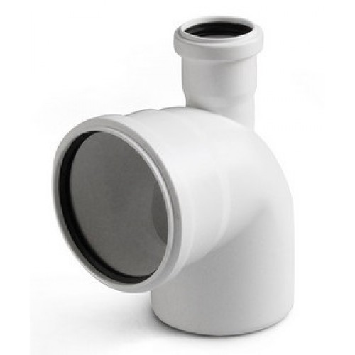 Отвод с выходом совмещает в себе функции тройника и отвода: он позволяет подключить дополнительный канализационный сток диаметром 50 мм в месте поворота магистральной водоотводящей трубы. Данная фасонная часть изготовлена из специальной композиции полипропилена с улучшенными шумопоглощающими и виброгасящими свойствами.