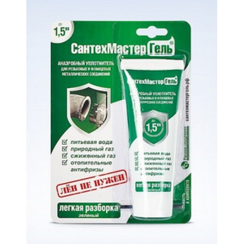 Анаэробный герметик для металлических резьбовых и фланцевых соединений. Образует высокопрочное уплотнение, устойчивое к различным средам: вода, природный и сжиженный газ, бензин, отопительные антифризы и др. СантехмастерГель — уплотнительный материал последнего поколения. Ранее такие материалы применялись только в сфере обороны, космоса и высокотехнологичного машиностроения, но в настоящее время получили широкое распространение благодаря продвижению на открытом рынке.