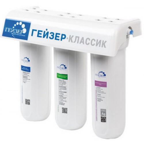 Фильтр трёхступенчатый ГЕЙЗЕР Классик для очистки водопроводной воды от хлора, тяжелых металлов, нитратов, пестицидов, избытка солей жесткости и др. примесей. В фильтре используется классическая для компании схема очистки с картриджем Арагон. В фильтре Гейзер-Классик на последней ступени используется новая разработка компании Гейзер – картридж БАФ, содержащий мультикомпонентную загрузку на основе сорбентов и ионообменных материалов. Это позволяет удалять не только хлор и органические примеси, но и снижать содержание железа и тяжелых металлов. Картридж БАФ является прекрасной альтернативой используемых в других моделях картриджей СВС и ММВ.
