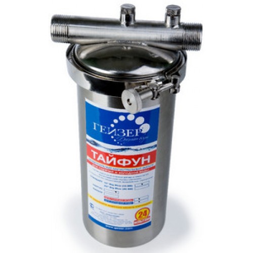 Корпус и крышка фильтра Гейзер Тайфун 10SL 3/4" изготовлены из высококачественной нержавеющей стали марки 304L. Корпус рассчитан на работу под давлением и установку на входе в систему горячего или холодного водоснабжения. Внизу корпуса находится клапан слива воды для удобной замены картриджа.