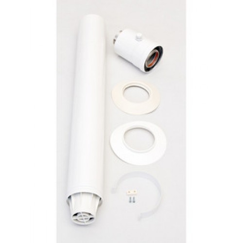 Комплект коаксиальный Ø60/100 - 750 мм для горизонтального монтажа. Состав: удлинение для отвода продуктов сгорания/притока воздуха Ø60/100 длиной 750 мм; соединительные хомуты (2 шт.); коаксиальный отвод 90°; оголовок дымохода; декоративные манжеты из EPDM (внутренняя и внешняя); прокладки и крепежные винты.