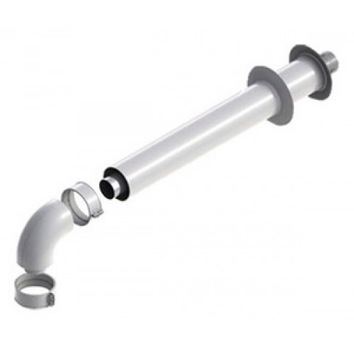 Базовый комплект оригинального дымохода включает в себя два хомута для крепления труб между собой и в выходу котла, коаксиальный поворот 87 градусов (обеспечивающий уклон трубы в сторону земли для стока конденсата), основную коаксиальную трубу 60 мм/100 мм и пластиковый наконечник, предотвращающий попадание птиц и животных в котел.