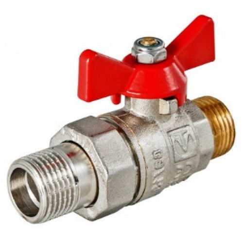 Прямой полнопроходной ремонтопригодный шаровой кран с увеличенным ресурсом. Соединен накидной гайкой с резьбовым полусгоном. Корпуса деталей – латунные, никелированные. Кран оснащен ручкой типа «бабочка» с утолщенной стенкой из алюминиевого сплава и эпоксидной покраской. Резьба присоединений – наружная/наружная.
