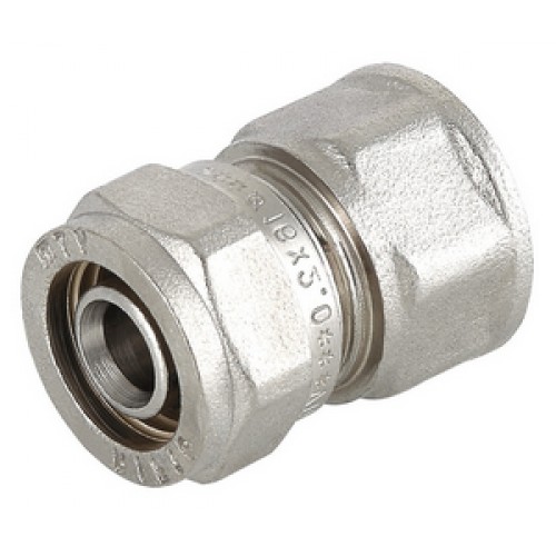Прямой латунный никелированный фитинг для соединения металлополимерной трубы и компонента системы с резьбовым подключением. Резьба фитинга – внутренняя трубная по ГОСТу 6357.