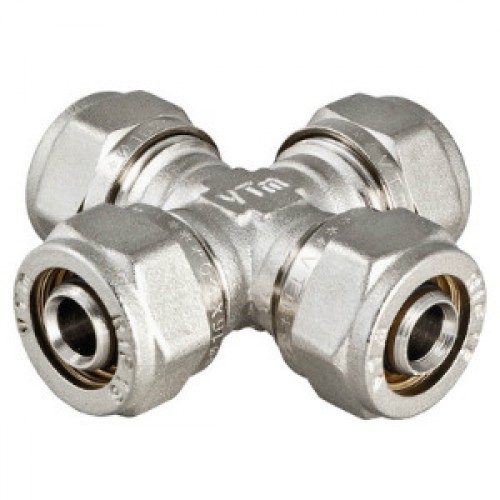 Фитинг обжимной крестовина для присоединения металлополимерных (металлопластиковых) трубопроводов. Предлагаются как равнопроходные модели, так и крестовины с разными диаметрами присоединяемых трубопроводов.