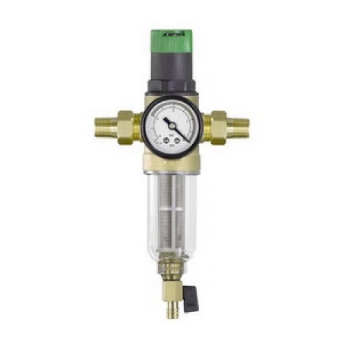 Фильтр промывной с редуктором снижения давления стеклянный корпус, комплектован: мини-кран 3/8", штуцер для соединения шланга, манометр аксиальный вариант присоединения: американки 1/2" наружной 1/2" наружной Имеется также отверстие для опломбировки
