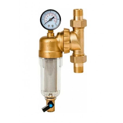 Фильтр с манометром для предварительной очистки холодной воды от механических примесей - частиц ржавчины, волокон пеньки, песчинок, защиты сантехники, бытовой техники подключенной к водопроводу.
