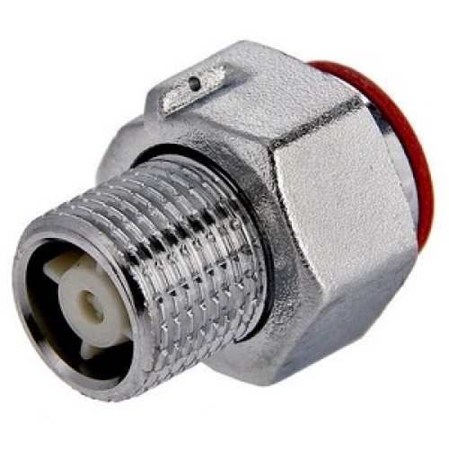 Латунный никелированный фитинг со встроенным обратным клапаном. Основное назначение – подключение водосчетчиков. Обеспечивает наличие прямых участков длиной в три условных диаметра до и после расходомера, необходимых для его точной работы. Накидная гайка имеет отверстие для пломбировки. Резьба со стороны без гайки: наружная, трубная цилиндрическая по ГОСТу 6357 (ISO 228, EN 10226).