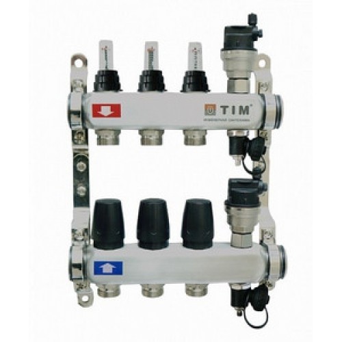 Коллекторные группы c расходомером используются в системах водяного напольного отопления для распределения и регулирования рабочей среды в системе. Каждая труба системы водоснабжения, отопительной системы теплого водяного пола подключается к коллектору, что позволяет осуществлять регулировку и контроль потока теплоносителя индивидуально в каждом циркуляционном контуре. Материал корпуса - нержавеющая сталь.