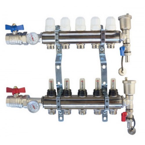 Коллекторный блок для систем водяного радиаторного и напольного отопления (водяной теплый пол) с регулировочными (настроечными) и ручными (с возможностью установки электротермического сервопривода) запорными клапанами, автоматическими воздухоотводчиками и дренажем.
