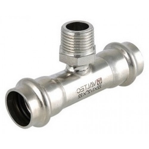 (VTi.933.I) Пресс-тройник из нержавеющей стали с наружной резьбой предназначен для соединения тонкостенных стальных труб с резьбовым элементом системы водоснабжения, отопления, других инженерных и технологических установок. Фитинг рассчитан на эксплуатацию при максимальной рабочей температуре 95 °С. Номинальное давление – 16 бар.