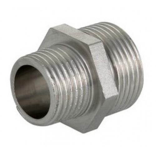 Ниппель переходной из нержавеющей стали в составе системы VT.INOX-PRESS предназначен для соединения элементов с внутренней резьбой разных диаметров. Резьба патрубка меньшего диаметра имеет насечки – для эффективного удержания уплотняющего материала. Шестигранный – под гаечный ключ – участок корпуса облегчает монтаж соединения. Материалом фитинга служит сталь марки AISI 304, устойчивая к коррозии, химическому и термическому воздействию. В то же время область рекомендуемого применения фитингов VT.INOX-PRESS исключает трубопроводы жидких углеводородов и хлороводородных растворов.