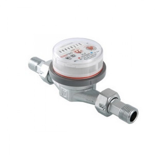 Водосчетчик универсальный – для измерения расхода холодной и горячей воды, главным образом – в квартирах. Условный диаметр модели – 1/2"; номинальный расход воды – 1,5 куб. м/ч. Длина прибора без сгонов – 110 мм. Резьба присоединительных патрубков – 3/4".