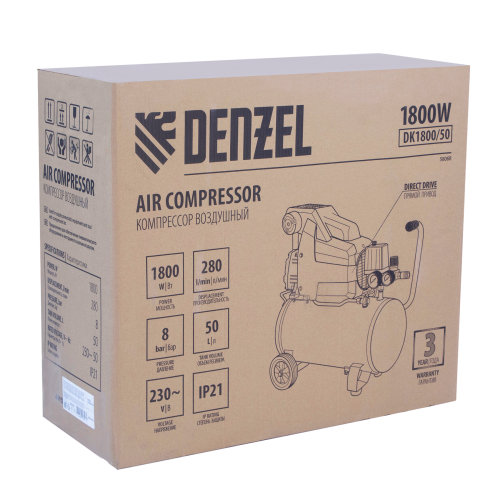 Воздушный компрессор Denzel Х-PRO DK1800/50 58068 мощностью 1,8 кВт, производительностью 280 л/мин, имеет ресивер объемом 50 л и подходит для бытового использования. Обеспечивает подачу воздуха к различным пневматическим инструментам: продувочному пистолету, краскопульту и др. Будет незаменим в гараже, когда надо подкачать колеса автомобиля или подкрасить его отдельные детали, а также на даче или в частной мастерской. Несмотря на простую конструкцию, компрессор имеет хорошую производительность и возможность подключения сразу нескольких инструментов.