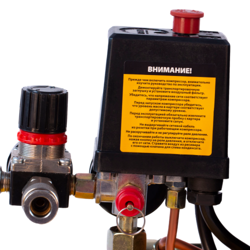 • Контроль рабочих параметров — два манометра отображают давление в ресивере и выходной магистрали.