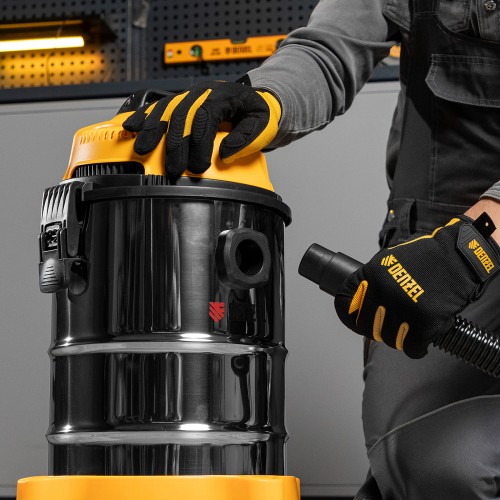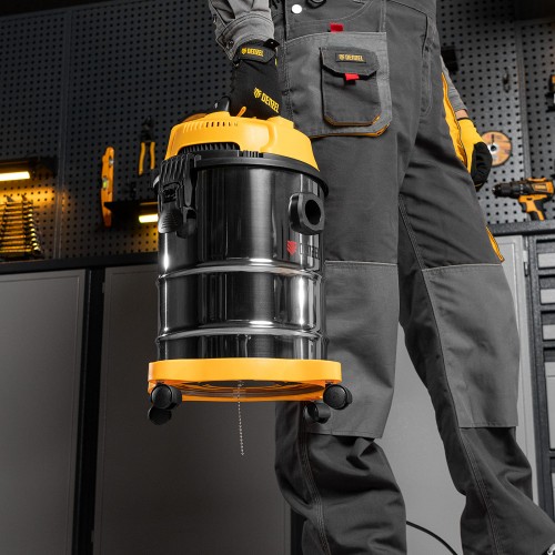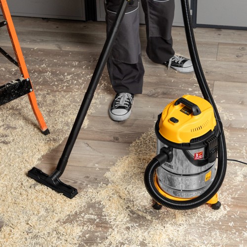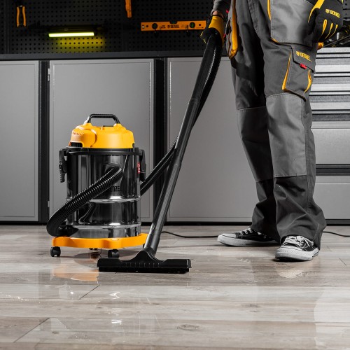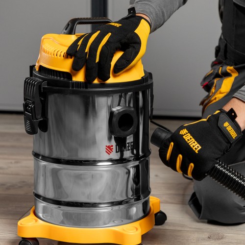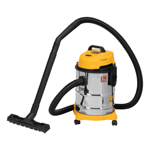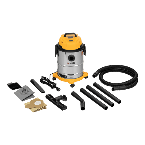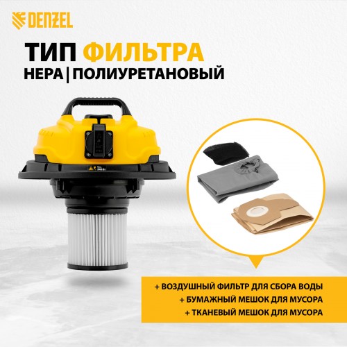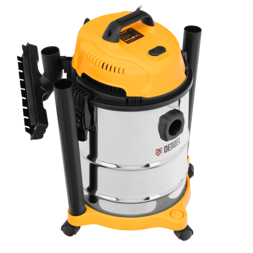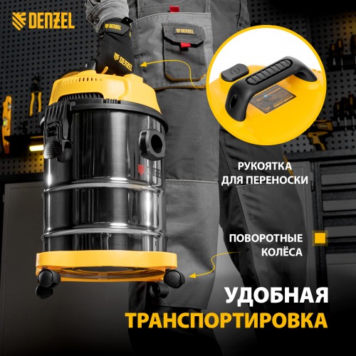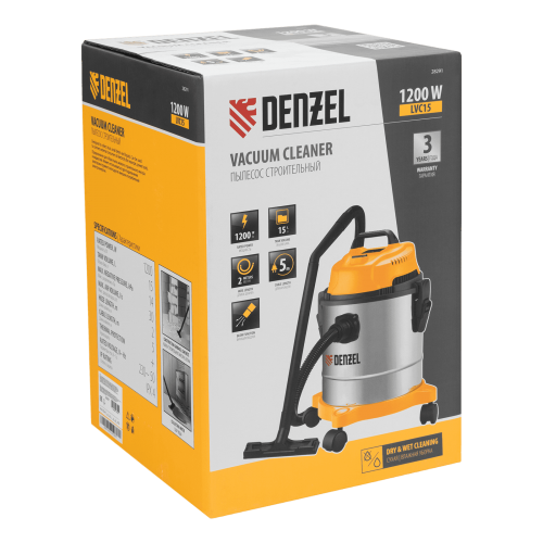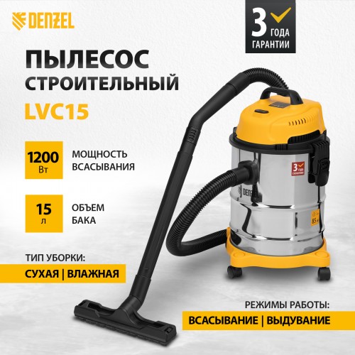 Строительный пылесос Denzel LVC15 28291 мощностью 1200 Вт, со шлангом длиной 2 м и баком объемом 15 л предназначен для уборки помещений: удаления бетонной, кирпичной пыли, а также для сбора воды. Высокоэффективный HEPA-фильтр задерживает мельчайшие загрязняющие частицы, предотвращая их попадание обратно в воздух. Пылесос пригодится для поддержания чистоты во время проведения строительных и ремонтных работ, будет полезен на складе, производстве и в гараже.; ;Преимущества;Надежность — корпус из нержавеющей стали устойчив к механическим повреждениям и коррозии.;Термозащита — в случае перегрева двигатель автоматически отключается для предотвращения поломки.;Автоматический контроль количества воды при сборе воды — при достижении максимально допустимого уровня срабатывает предохранительный клапан и всасывание прекращается.;Эффективная уборка в узком пространстве — щелевая насадка облегчает удаление мусора и пыли из ящиков, труднодоступных мест, отопительных радиаторов.;Дополнительные возможности — функция выдува позволяет удалять мусор и листву с дорожек, ступеней, из труднодоступных мест, а также очищать различные детали от пыли.;Готовность к работе — в комплект поставки входят необходимые фильтры и мешки для мусора, в т.ч. многоразовый тканевый.;Комфортная эксплуатация — длина сетевого кабеля составляет 5 м, что позволяет свободно передвигаться по рабочей зоне.;Мобильность — ручка и поворотные колеса облегчают перемещение пылесоса.;Гарантия 3 года — надежность техники подтверждена производителем.