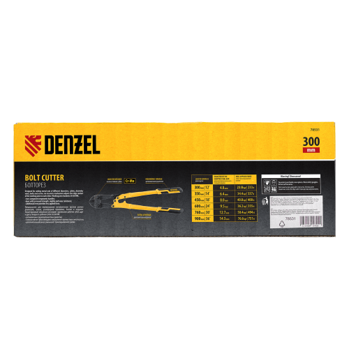Болторез Denzel 78531 длиной 300 мм (12 дюймов), из стали Cr-Mo, предназначен для перекусывания стальных прутков диаметром 4,8 мм, болтов и шурупов, тросов, разнородной проволоки.