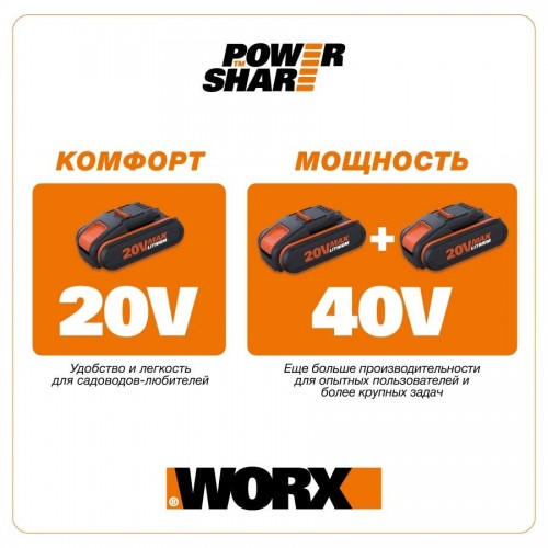 Аккумуляторная циркулярная пила WORX WX530 20V работает от универсальных литий-ионных аккумуляторных батарей WORX PowerShare ёмкостью 2 А/ч, 4 А/ч и 6 А/ч. Эти батареи совместимы со всей аккумуляторной техникой WORX PowerShare: с линейками 20V, 40V и 80V.