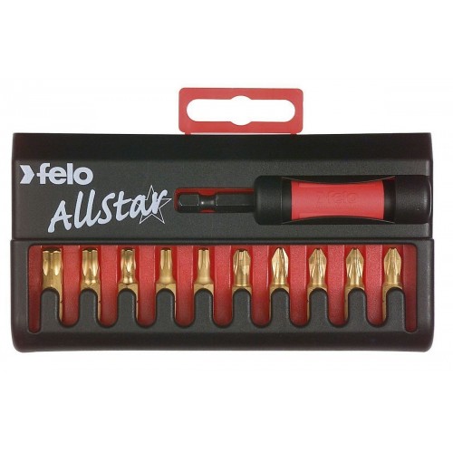 Felo Набор из 10 бит PZ/Tx TiN 25 мм с держателем бит Star в кейсе размерами PZ 2, PZ 3, Tx 20, Tx 25, Tx 30 и Tx 40. Набор предназначен для работ с различного рода крепежом.