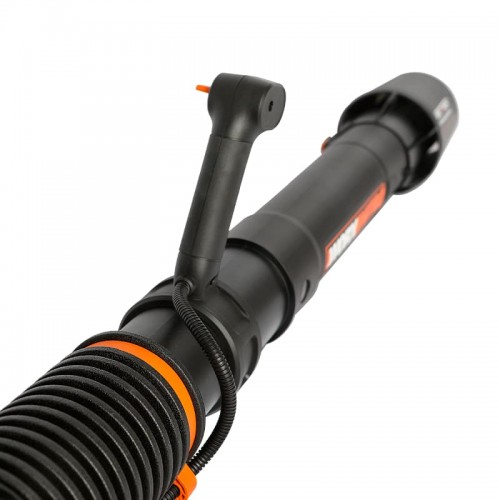 Воздуходувка оснащена специальным ранцевым креплением аккумуляторного блока, что снижает нагрузку на руки оператора и позволяет работать с устройством в течение длительного времени без большого утомления.