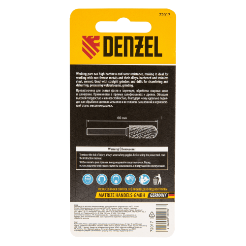 Твердосплавная борфреза Denzel 72017 с цилиндрической закругленной рабочей частью (тип C), диаметром 10 мм, предназначена для шлифовальных работ по металлу: закаленной и нержавеющей стали, латуни, чугуну, бронзе, титану, меди. Также используется для обработки искусственного камня и металлокерамики. Борфреза позволяет зачищать сварные швы, удалять заусенцы и снимать фаски. Форма рабочей части оптимальна для обработки радиусных пазов, поверхностей с плавными изгибами. Также с помощью борфрезы можно быстро и эффективно восстановить гравировку. Оснастка устанавливается на дрель или прямошлифовальную машину.