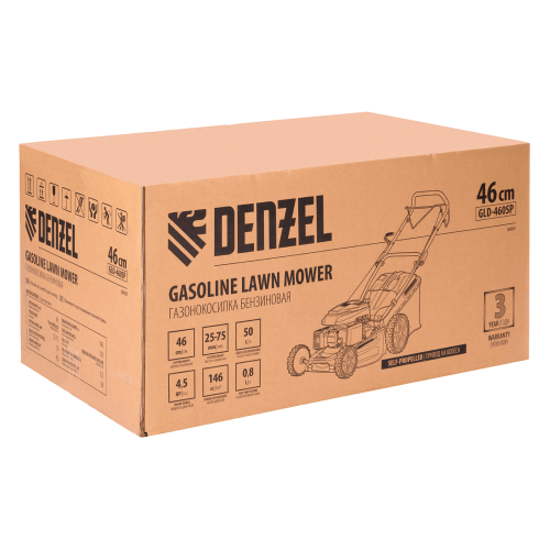 Газонокосилка бензиновая Denzel GLD-460SP 58803 с двигателем объемом 146 куб.см, с приводом, отличается шириной прохода 46 см, имеет 7 уровней скашивания и оборудована травосборником на 50 л. Предназначена для срезания и мульчирования травы на приусадебном участке. Усиленная дека, увеличенный диаметр колес и прочный нож обеспечивают эффективное окашивание сложной территории с зарослями и стеблями. При систематическом применении газонокосилка предотвращает распространение сорняков на участке.;Двигатель Denzel обеспечивает высокую скорость вращения ножа в 3000 об/мин, разумно потребляя топливо. Одного бака хватает на 40-60 минут работы. Ширина скашивания травы за один проход составляет 46 см — таким образом, за 1,5 часа Вы обработаете около 2500 кв. м. Косилка формирует газон высотой от 25 до 75 мм. Всего доступно 7 уровней скашивания, поэтому можно создать как спортивную площадку, так и элитный партерный газон.