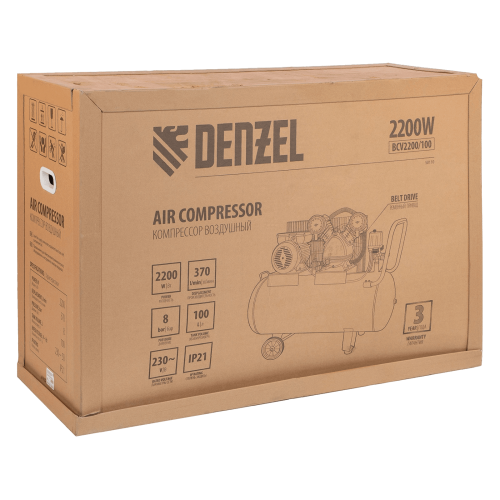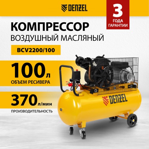 Компрессор воздушный DENZEL BCV2200/100, 2.2 кВт, ременный привод, 100 литров, 370 л/мин
