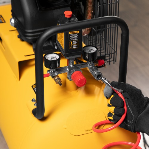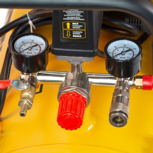 • Удобный контроль работы — 2 манометра позволяют без труда отслеживать уровень давления как в ресивере, так и на выходной магистрали.
