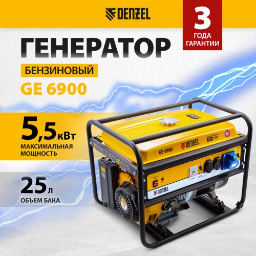 Бензиновый генератор Denzel GE 6900 94637 мощностью 5,5 кВт, 220 В / 50 Гц, с ручным стартом и баком объемом 25 л, подходит для использования в загородном доме, в торговой точке, на стройке или предприятии. Одновременно к нему можно подключить, например, 4 лампы накаливания, холодильник, телевизор и чайник. Силовая розетка позволяет подключать мощное электрооборудование. Полного бака хватает на 10 ч работы без дозаправки.