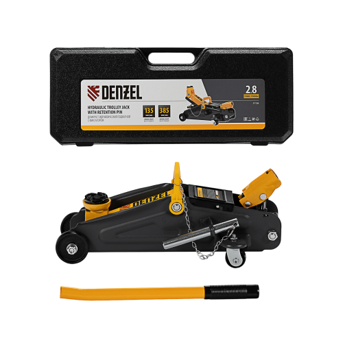 Домкрат гидравлический DENZEL подкатной с фиксатором, 2,8 т, 135-385 мм, в кейсе