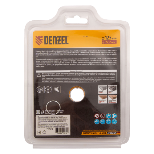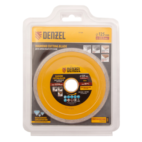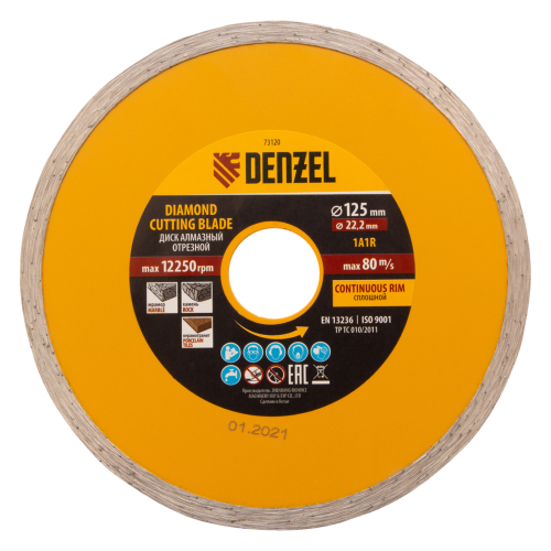 Отрезной алмазный диск Denzel «Сплошной» 73120 диаметром 125 х 22,2 мм используется для «мокрого» резания совместно с углошлифовальной машиной или плиткорезом с соответствующим посадочным диаметром. Режет камень, мрамор, керамогранитную и керамическую плитку. Диск отличается хорошей производительностью за счет высокой скорости реза, поэтому подходит для профессионального применения.